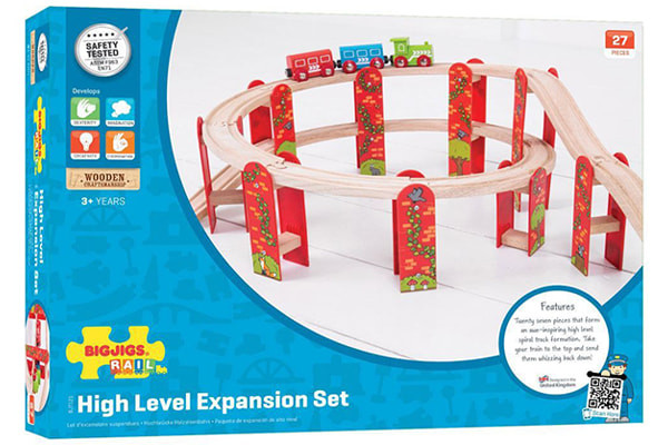 Met de rode high level uitbreidings set van Bigjigs kun je de hoogte in bouwen. Met behulp van de kunststof pilaren is het eenvoudig om je rails te laten stijgen. Deze 39 delige treinset bestaat uit 10 pilaren met verschillenden hoogte en 17 stukjes rail. De totale hoogte van de high level set is 21 cm.