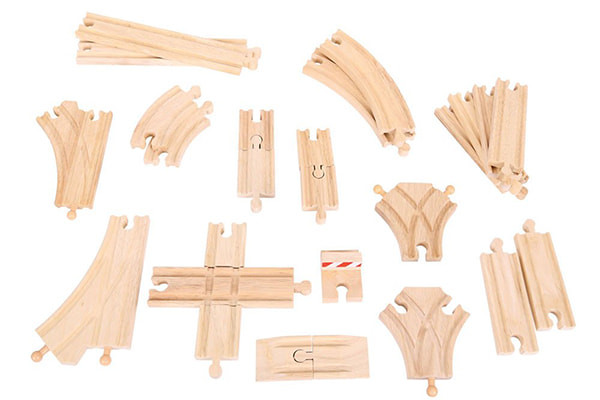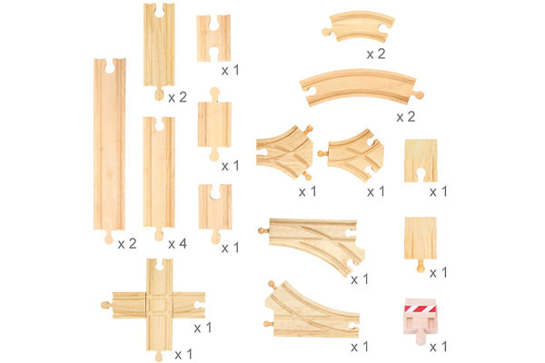 De spoor uitbreidings pakket van Bigjigs. Deze houten trein uitbreidings set bestaat uit een kruispunt, stootblok, 2 korte bochten, 2 lange bochten, op- en aftrit, 4 verschillende rails wissels, 2 lange baandelen met een lengte van 22 cm, 4 baandelen met een lengte van 14 cm en 2 baandelen met een lengte van 11 cm. Daarnaast zitten er in dit pakket nog 3 korte baandelen waarvan 1 x vrouw - vrouw, 1 x man - man en 1 x vrouw - man. Een complete uitbreidingsset voor kinderen vanaf 3 jaar.
