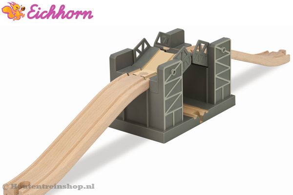 Beweegbare brug van Eichhorn voor je houten trein. Multifunctionele brug. Je trein kan zowel over de brug als door de tunnel rijden. De delen van de brug kunnen handmatig geopend worden zodat je houten trein de tunnel gemakkelijk kan passeren.